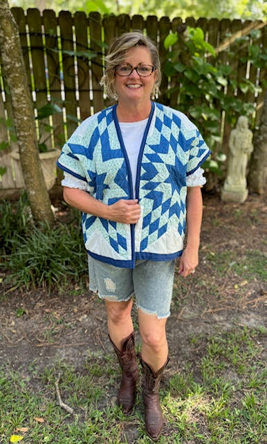 This beautiful hand stitched Carolyn's Star style quilt jacket is blue, light blue and white. One style fits most.