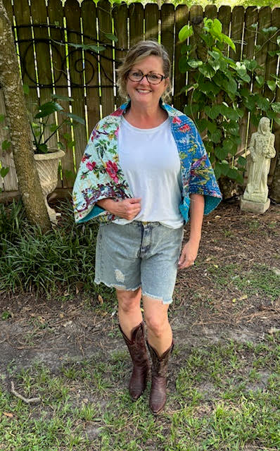 This beautiful Kantha style quilt jacket is the perfect accent to an outfit! 14"x22.5" front and back. The entire measurements are 28"x45". One size fits most.